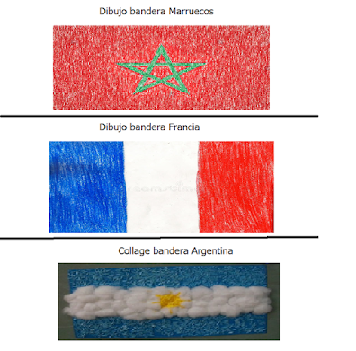 Os dejo un ejemplo de como podría ser: las banderas de Marruecos y Francia estarían dibujadas y coloreadas, mientras que la de Argentina sería como un collage. En estas actividades de crear podéis ser todo lo creativos que queráis. Si a alguien se le ocurre otra forma de hacerlo diferente a dibujos y collage, también es válido.